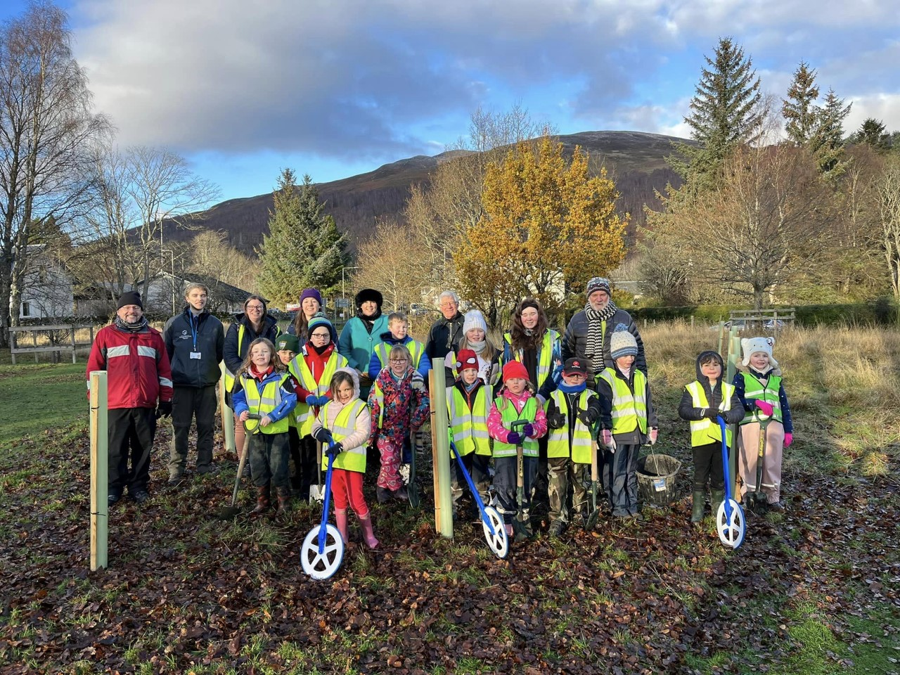 Cameron McNeish, Patron of Perth and Kinross Countryside Trust, wilderness hiker, backpacker and mountaineer joined the children from Kinloch Rannoch Primary School for an outdoor educational morning, planting trees at Weller Poley Park as part of the Tree for Every Child project, assisted by trustees and staff. 15 new trees were planted in the park. Alex Cairncross DL addressed the children before presenting the head teacher and chair of the Weller Poley Park Committee with a commemorative plaque. Trees were supplied by The Woodland Trust as part of the Queen’s Green Canopy.