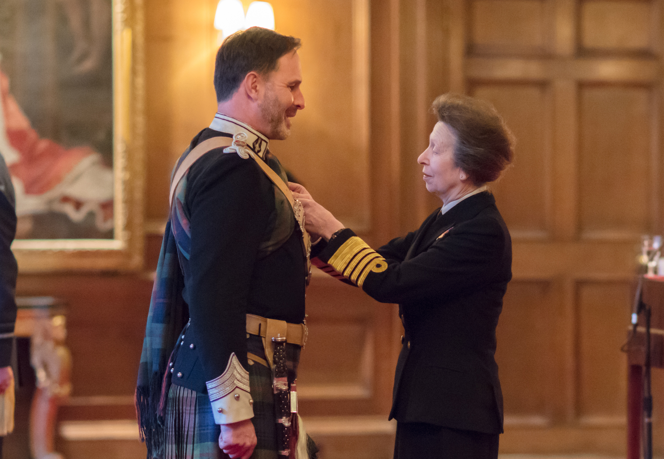 John Bullough of Culcreuch MBE receiving his honour from HRH Princess Anne at Holyrood Palace. His award is for services to the Emergency Services and the Community of Perth. He is founding Chairman of SCAA, Scotland’s Charity Air Ambulance, a long serving Special Constable with Police Scotland in Perth, he served as Chair on the Perth City Development Board for 10 years and was the instigator of the successful bid to bring the Stone of Destiny to Perth. John is wearing the uniform of the Atholl Highlanders, in which he holds the rank of Major and Regimental Adjutant.